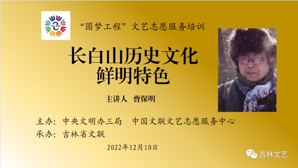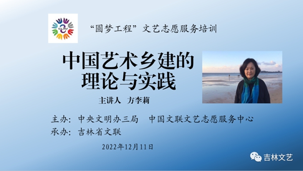 12月10—11日,由中央文明办三局、中国文联文艺志愿服务中心主办,吉林省文联承办,吉林省磐石市文联、抚松县文联协办的“圆梦工程”文艺志愿服务培训班(线上部分)圆满结束。本次培训班,旨在深入学习宣传贯彻党的二十大精神,切实发挥文联系统组织优势和专业优势,提升基层文艺队伍政治素养、创作能力、职业道德和专业水平,近400名文艺骨干、“文艺两新”骨干、乡村艺术教师参加了培训。