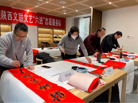 1月13日,由陕西省文联主办的“我们的中国梦——送万福 进万家”陕西省文联文艺“六进”书法志愿服务队走进赵公故里,书法艺术家们现场挥毫泼墨,为企业和职工送上新年的美好祝福。