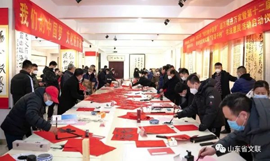 1月13日,2023年“我们的中国梦”送万福进万家暨第十二届山东省文联新时代文明实践“百县千村”书法惠民活动在济南市历城区相公庄村举行。19位书法家现场挥毫泼墨、笔走龙蛇,为相公庄村村民创作了春联、福字等500余件书法作品,为即将到来的新年增添了浓浓的节庆气氛,受到村民的热烈欢迎。