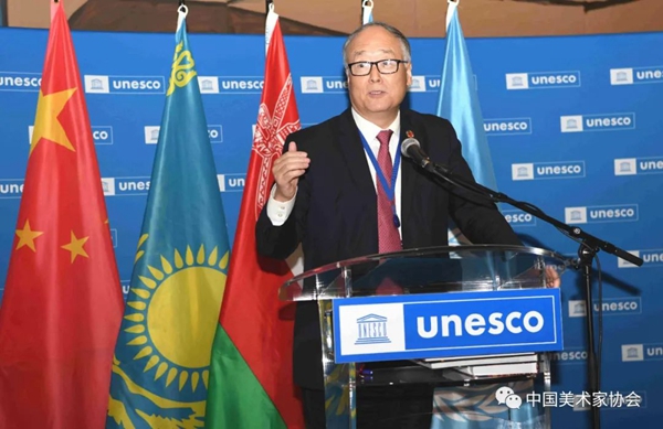 4月6日,由中国、阿塞拜疆、哈萨克斯坦、蒙古、阿曼常驻联合国教科文组织代表团同联合国教科文组织联合举办的庆祝丝绸之路旗舰项目35周年系列活动在巴黎成功举办。同期,中国美术家协会应中国常驻联合国教科文组织代表团之邀,在巴黎联合国教科文组织总部举办的“丝绸之路杰出艺术作品展”也举行了隆重的推介仪式。联合国教科文组织人文与社会科学助理总干事加布里埃拉·拉莫斯、中国常驻联合国教科文组织代表杨进、各国常驻联合国教科文组织代表团外交官、教科文组织秘书处官员以及在法研究机构、高校等近千人出席了包括展览推介仪式在内的系列庆祝活动。
