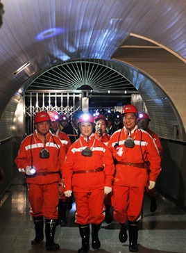 邓玉华(中)在石槽村矿筹建处乘坐现代化罐笼深入+1075水平等候硐室现场拍摄