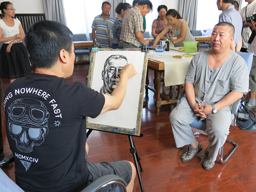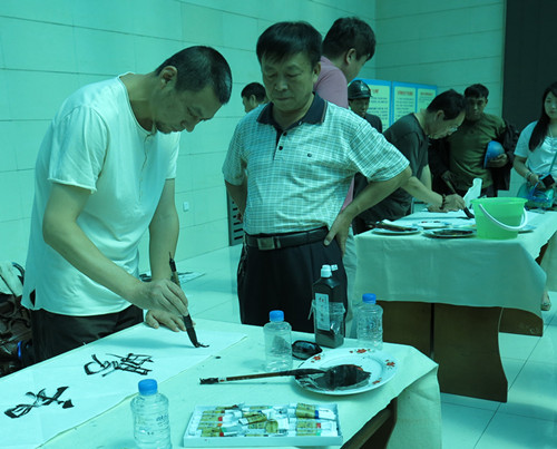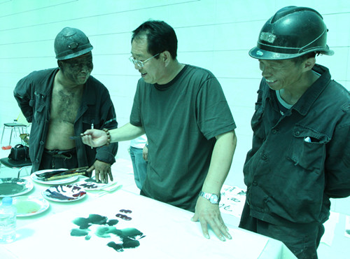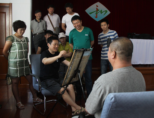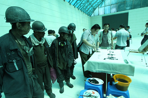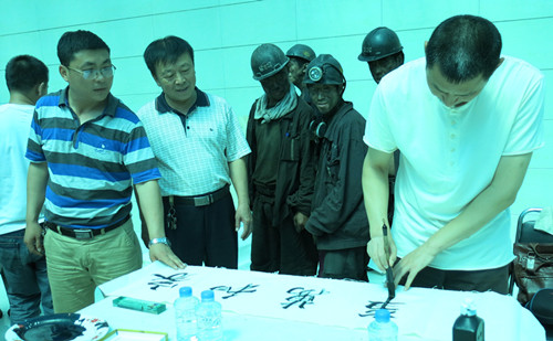 这次活动,煤矿美协做了精心准备,面对基层美术爱好者的具体情况,先后作了油画艺术讲座,山水画艺术讲座,以及在辅导交流互动中分别有山水,花鸟,书法,油画,素描,速写等的技法展示和写生,有七十多位企业职工参加了这次活动。他们分别围绕他们自己喜欢的画种,看老师作画,屏气凝神,全神贯注,生怕漏掉关键的几笔处理。有的学员甚至一直追随辅导老师来到矿业公司所属的杏花矿,在矿工升井后的一间大棚里,看老师为满身煤屑的矿工画速写,为这些可敬的人们画吉祥画,写祝福的条幅。