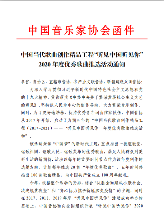 “听见中国听见你”2020年度优秀歌曲推选活动通知