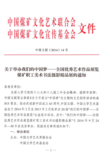 关于举办我们的中国梦——全国优秀艺术作品展览煤矿职工美术书法摄影精品展的通知 来源:中国煤矿文化网 作者: 时间:2014-08-04 【字体:小 大】 附:我们的中国梦——全国优秀艺术作品展览煤矿职工美术书法摄影精品展报送表 分享到: 【打印正文】