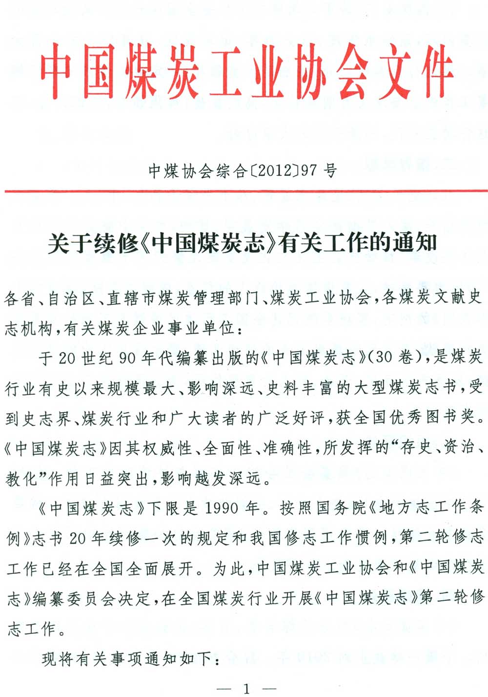 关于续修《中国煤炭志》有关工作的通知