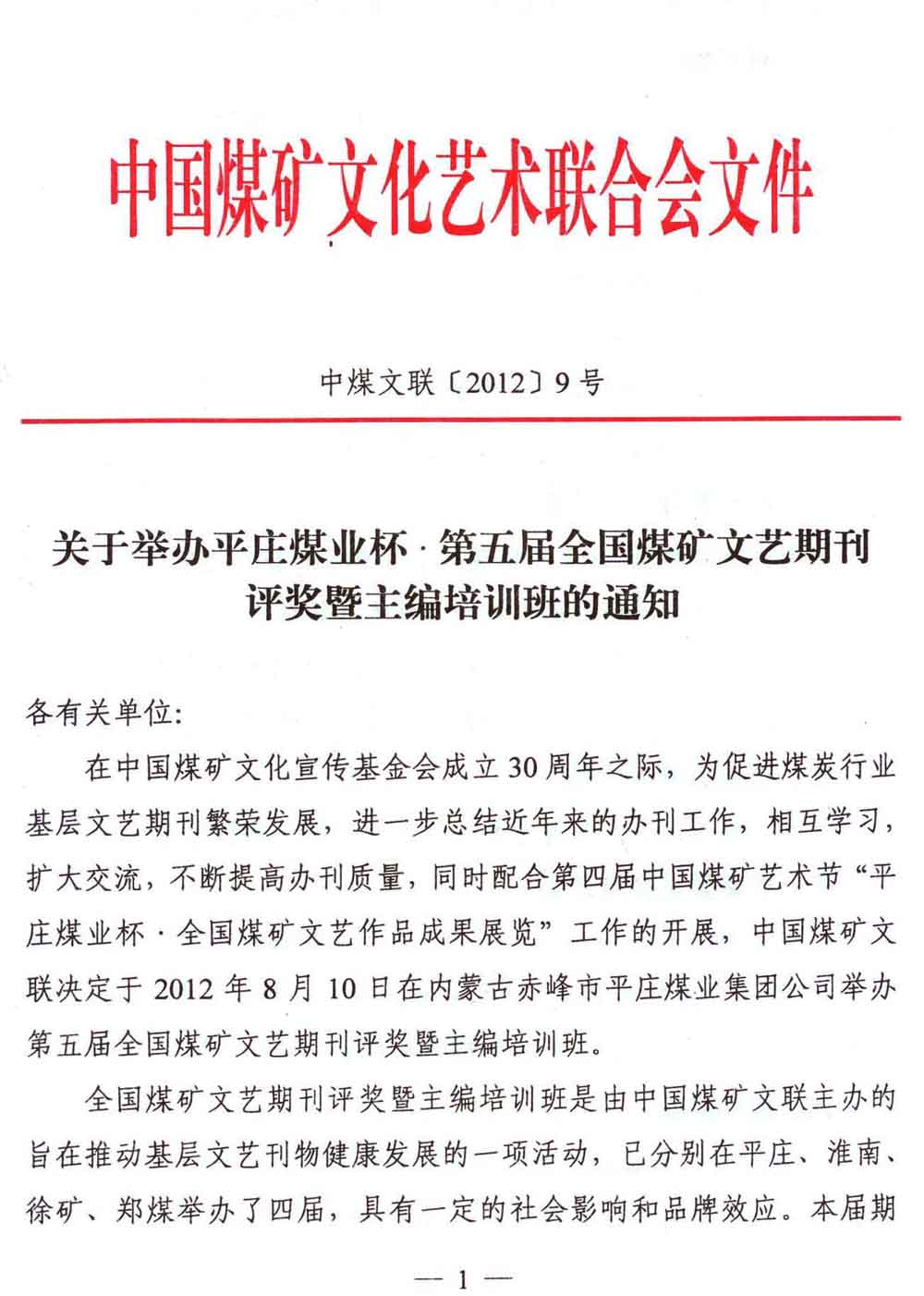 关于举办平庄煤业杯·第五届全国煤矿文艺期刊评奖暨主编培训班的通知