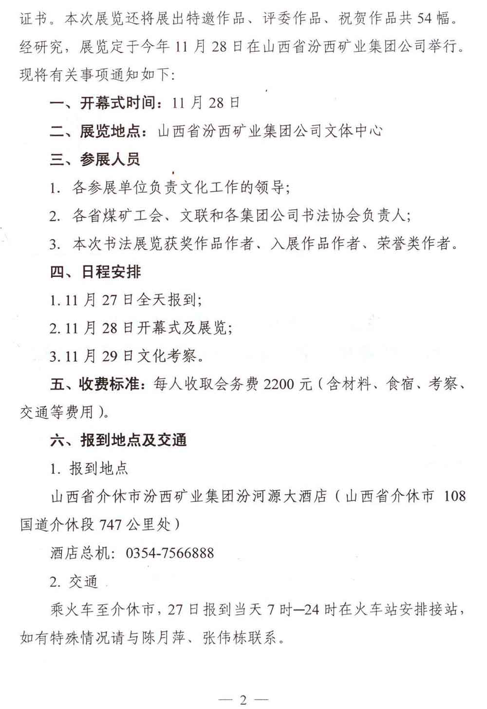 关于举办第四届中国煤矿艺术节“汾西矿业杯全国煤矿职工书法展览”的通知 来源:中国煤矿文化网 作者:煤矿文联 时间:2012-11-07 【字体:小 大】 附件: 1.第四届中国煤矿艺术节汾西矿业杯全国煤矿职工书法展览获奖名单 2.第四届中国煤矿艺术节汾西矿业杯全国煤矿职工书法展览评委会名单 3.参加第四届中国煤矿艺术节汾西矿业杯全国煤矿职工书法展览回执 分享到: 【打印正文】