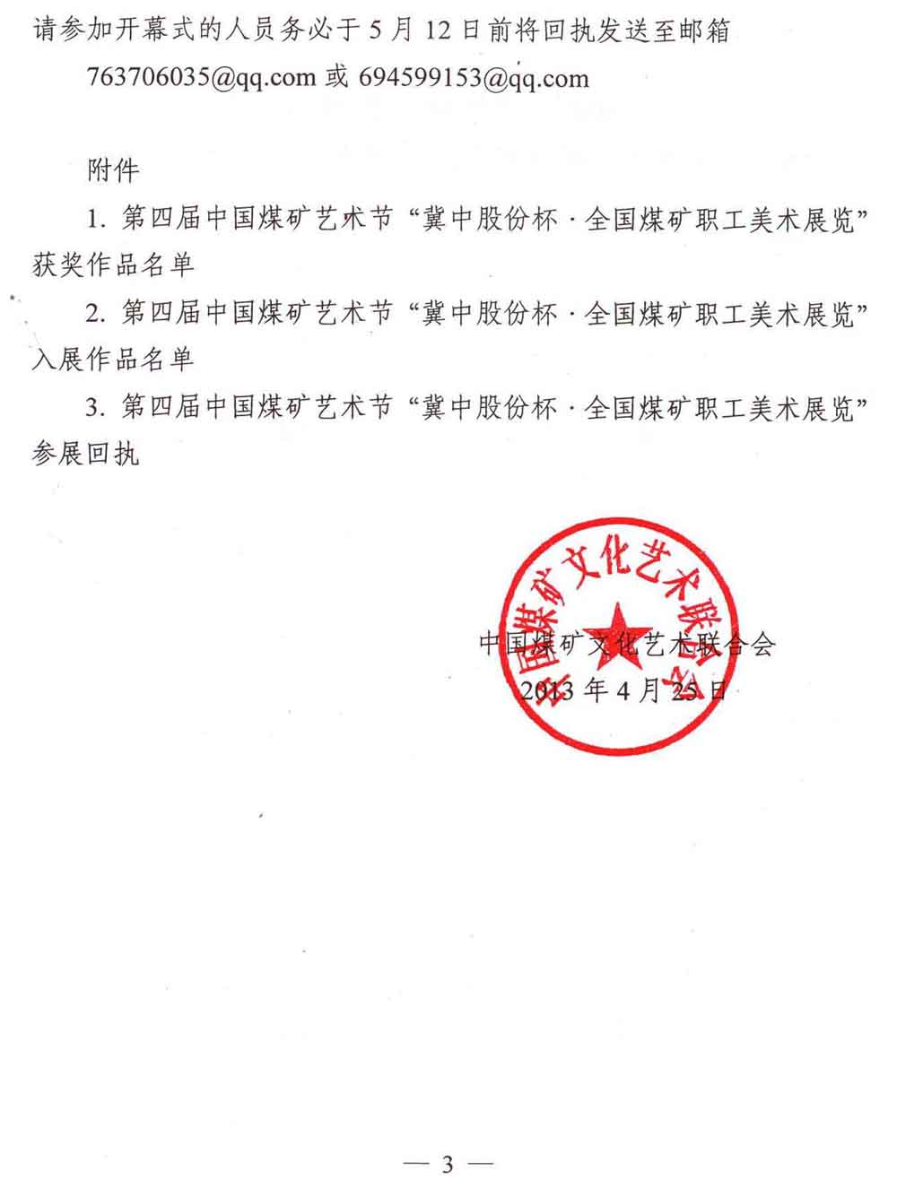 关于举办第四届煤矿艺术节“冀中股份杯全国煤矿职工美术展览”的通知 来源:中国煤矿文化网 作者:煤矿文联 时间:2013-05-02 【字体:小 大】 附件: 1.第四届中国煤矿艺术节冀中股份杯·全国煤矿职工美术展览获奖作品名单 2.第四届中国煤矿艺术节冀中股份杯·全国煤矿职工美术展览入选作品名单 3.第四届中国煤矿艺术节冀中股份杯·全国煤矿职工美术展览参展回执 分享到: 【打印正文】