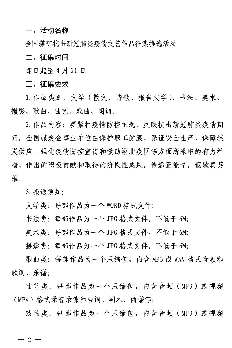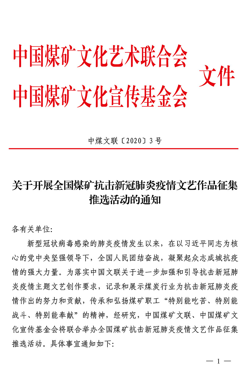 关于开展全国煤矿抗击新冠肺炎疫情文艺作品征集推选活动的通知 来源:中国煤矿文联 作者: 时间:2020-03-11 【字体:小 大】 附件:关于开展全国煤矿抗击新冠肺炎疫情文艺作品征集推选活动的通知(PDF版)全国煤矿抗击新冠肺炎疫情文艺作品登记表 智能标签: 中国煤矿文联 相关内容 分享到: 【打印正文】