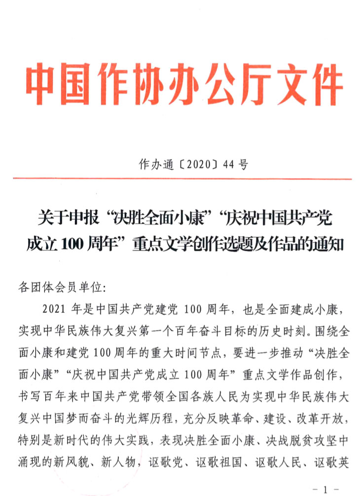 中国作协:关于申报“决胜全面小康”“庆祝中国共产党成立100周年”重点文学创作选题及作品的通知