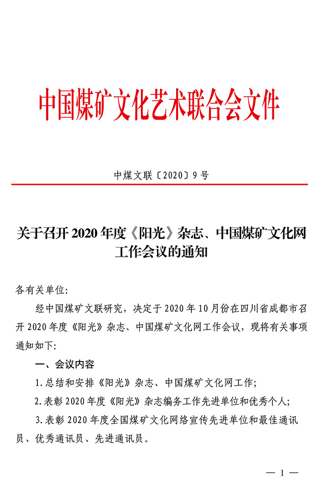 关于召开2020年度《阳光》杂志、中国煤矿文化网工作会议的通知 来源:中国煤矿文联 作者: 时间:2020-09-21 【字体:小 大】 关于召开2020年度《阳光》杂志、中国煤矿文化网工作会议的通知(PDF版及附件1-2)附件3:会议回执 分享到: 【打印正文】