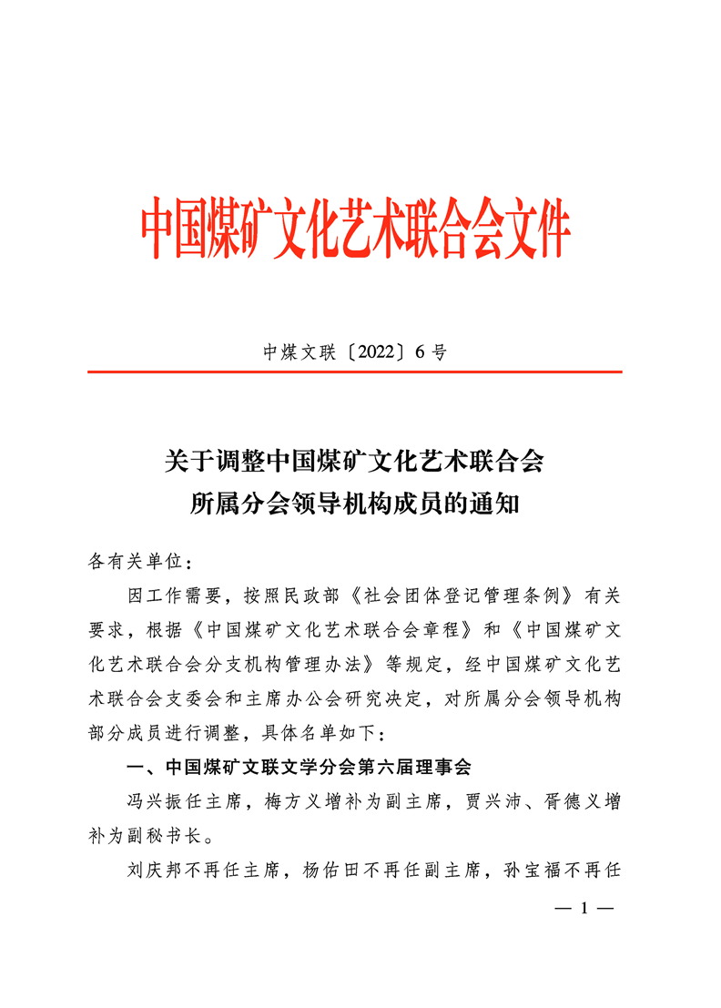 关于调整中国煤矿文联所属分会领导机构成员的通知