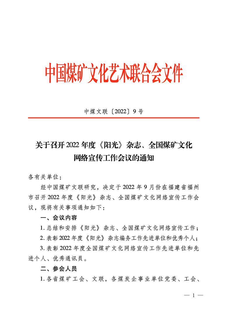 关于召开2022年度《阳光》杂志、全国煤矿文化网络宣传工作会议的通知