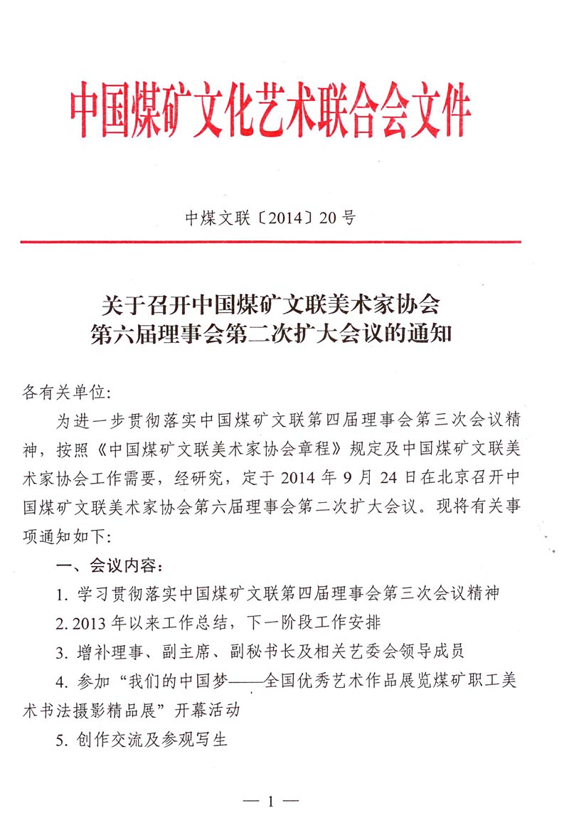关于召开中国煤矿文联美术家协会第六届理事会第二次扩大会议的通知 来源:中国煤矿文联 作者: 时间:2014-08-29 【字体:小 大】 附件:1. 中国煤矿文联美术家协会理事及重点作者名单 2. 参加会议人员回执 分享到: 【打印正文】