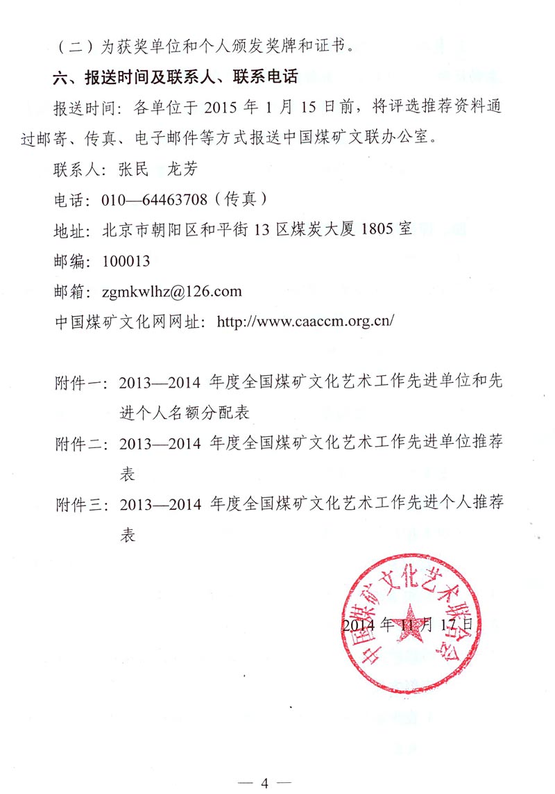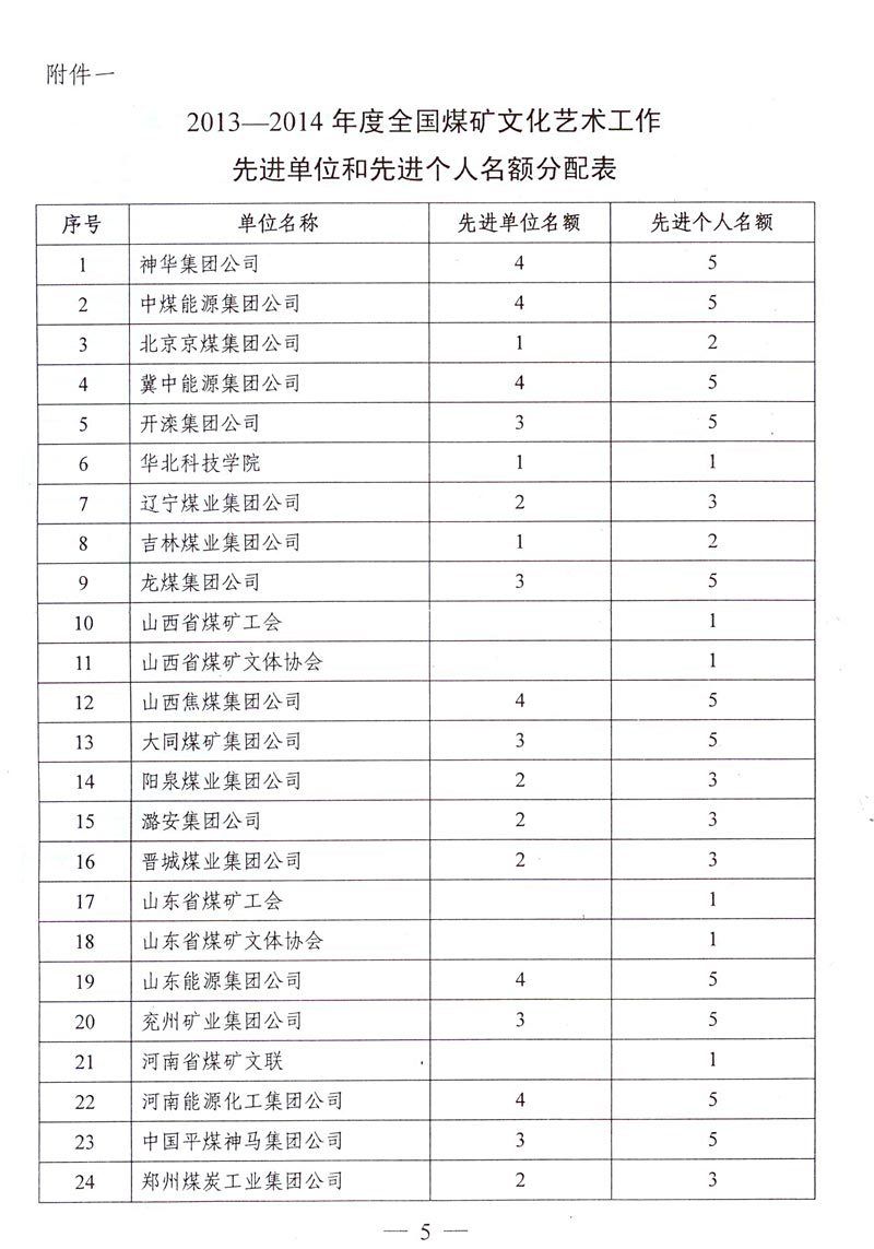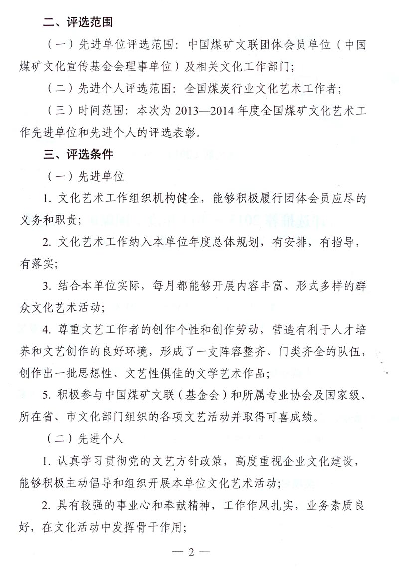 关于评选推荐2013—2014年度全国煤矿文化艺术工作先进单位和先进个人的通知 来源: 作者: 时间:2014-11-21 【字体:小 大】 附件下载: 附件一:2013—2014年度全国煤矿文化艺术工作先进单位和先进个人名额分配表 附件二:2013—2014年度全国煤矿文化艺术工作先进单位推荐表 附件三:2013—2014年度全国煤矿文化艺术工作先进个人推荐表 智能标签: 全国煤矿 文化艺术工作 先进单位 先进个人 相关内容 分享到: 【打印正文】