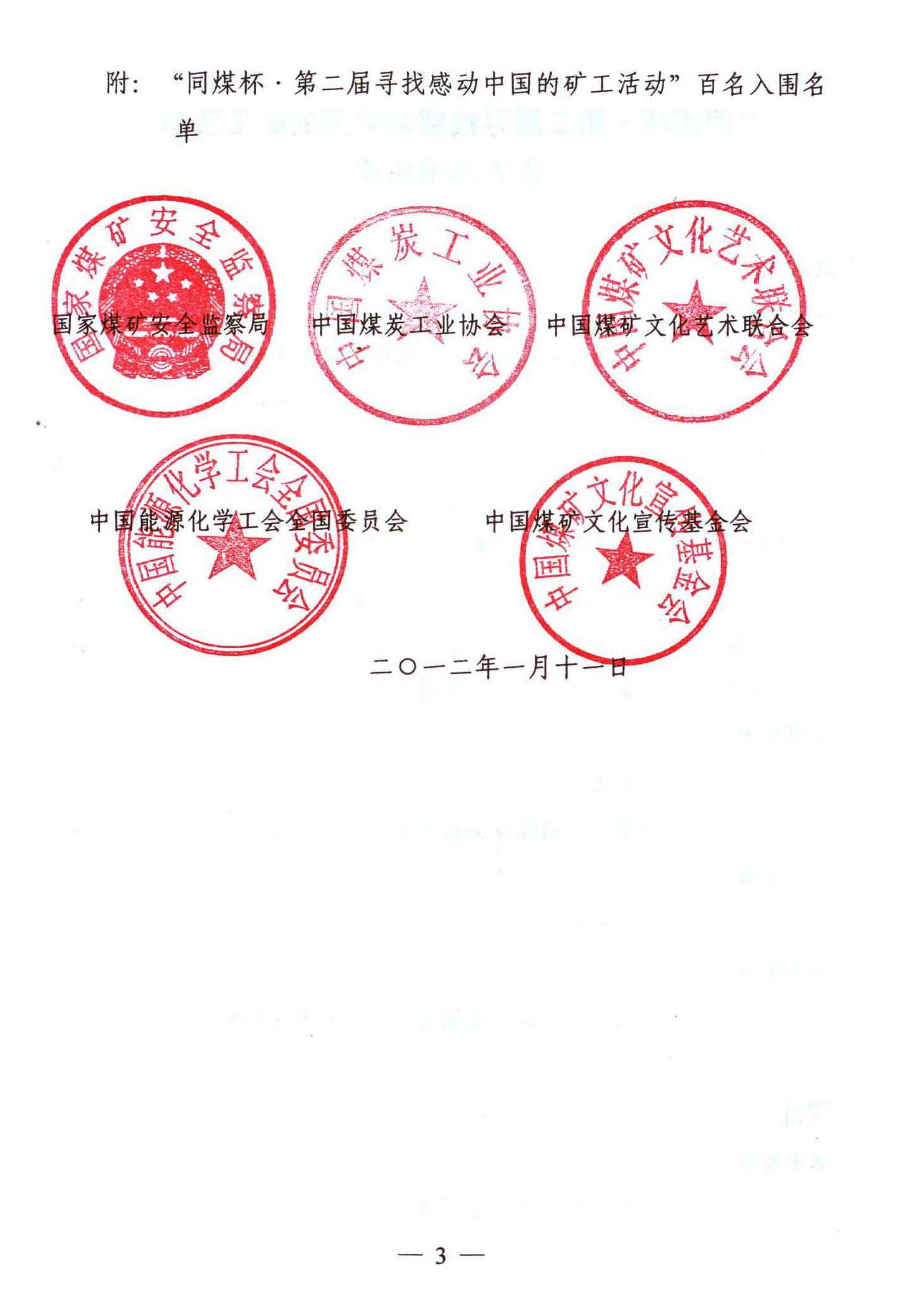 关于公布“同煤杯第二届寻找感动中国的矿工活动”百名入围名单的通知 来源:中国煤矿文联 作者:夏周 时间:2012-01-11 【字体:小 大】 附:同煤杯第二届寻找感动中国的矿工活动百名入围名单 分享到: 【打印正文】