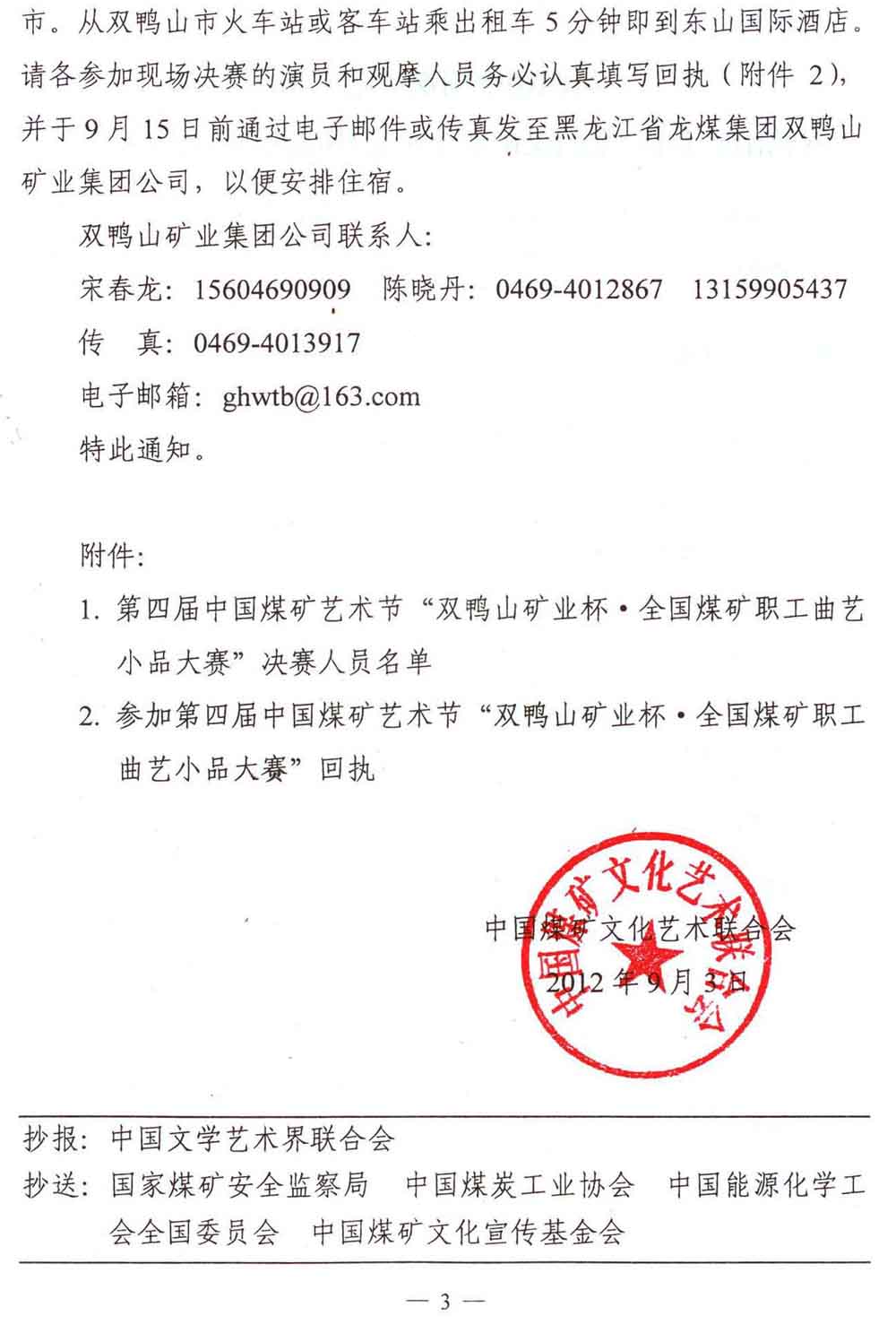 关于举行第四届中国煤矿艺术节“双鸭山矿业杯·全国煤矿职工曲艺小品大赛”的通知 来源:中国煤矿文化网 作者: 时间:2012-09-07 【字体:小 大】 附件:参加第四届中国煤矿艺术节双鸭山矿业杯全国煤矿职工曲艺小品大赛回执 分享到: 【打印正文】