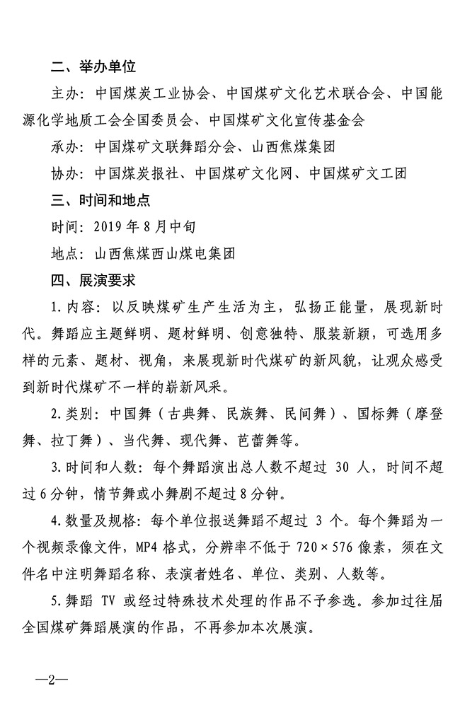 关于举办第五届中国煤矿艺术节第四届全国煤矿职工舞蹈展演的通知 来源:中国煤矿文联 作者: 时间:2019-04-17 【字体:小 大】 附件:关于举办第五届中国煤矿艺术节第四届全国煤矿职工舞蹈展演的通知(PDF版)第五届中国煤矿艺术节第四届全国煤矿职工舞蹈展演登记表 智能标签: 中国煤矿文联 相关内容 分享到: 【打印正文】