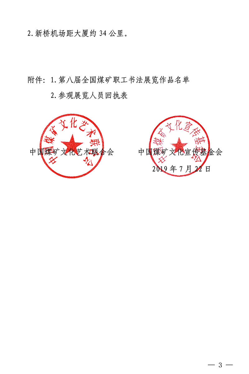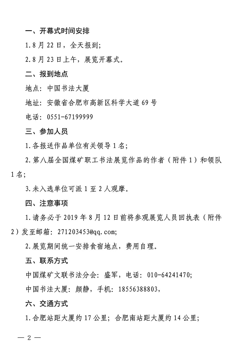 关于参观第八届全国煤矿职工书法展览的通知 来源:中国煤矿文联 作者: 时间:2019-07-26 【字体:小 大】 附件:· 关于参观“庆祝新中国成立70周年”第五届中国煤矿艺术节“中国书法大厦杯”第八届全国煤矿职工书法展览的通知(PDF版,含附件1)· 参观展览人员回执表(附件2) 智能标签: 中国煤矿文联 中国煤矿艺术节 相关内容 分享到: 【打印正文】