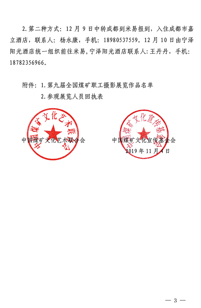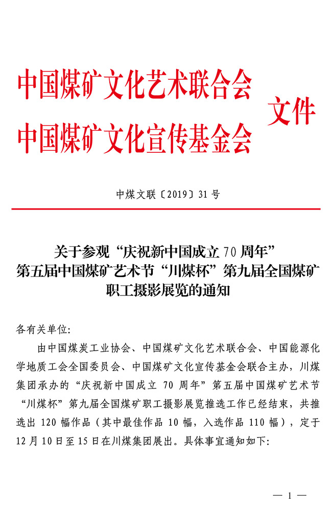 关于参观“庆祝新中国成立70周年”第五届中国煤矿艺术节“川煤杯”第九届全国煤矿职工摄影展览的通知 来源:中国煤矿文联 作者: 时间:2019-11-18 【字体:小 大】 附件:关于参观“庆祝新中国成立70周年”第五届中国煤矿艺术节“川煤杯”第九届全国煤矿职工摄影展览的通知(PDF版,含附件1)参观展览人员回执表 智能标签: 中国煤矿文联 中国煤矿艺术节 相关内容 “同心同行”2021年度全国煤炭交易会暨中国太原煤炭交易大会煤矿职工文艺演出举行 分享到: 【打印正文】