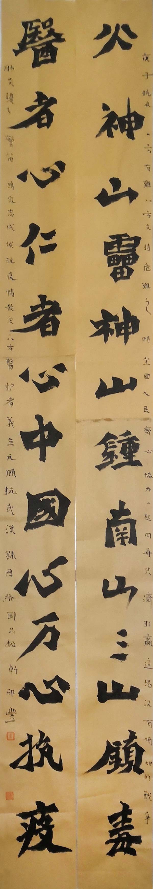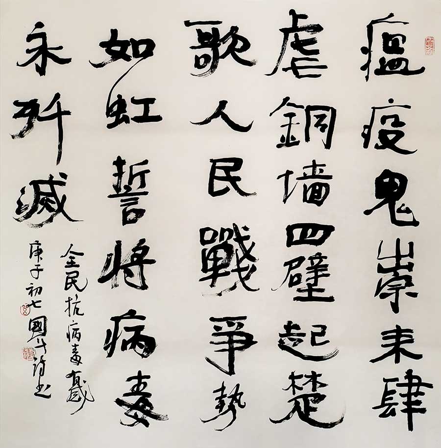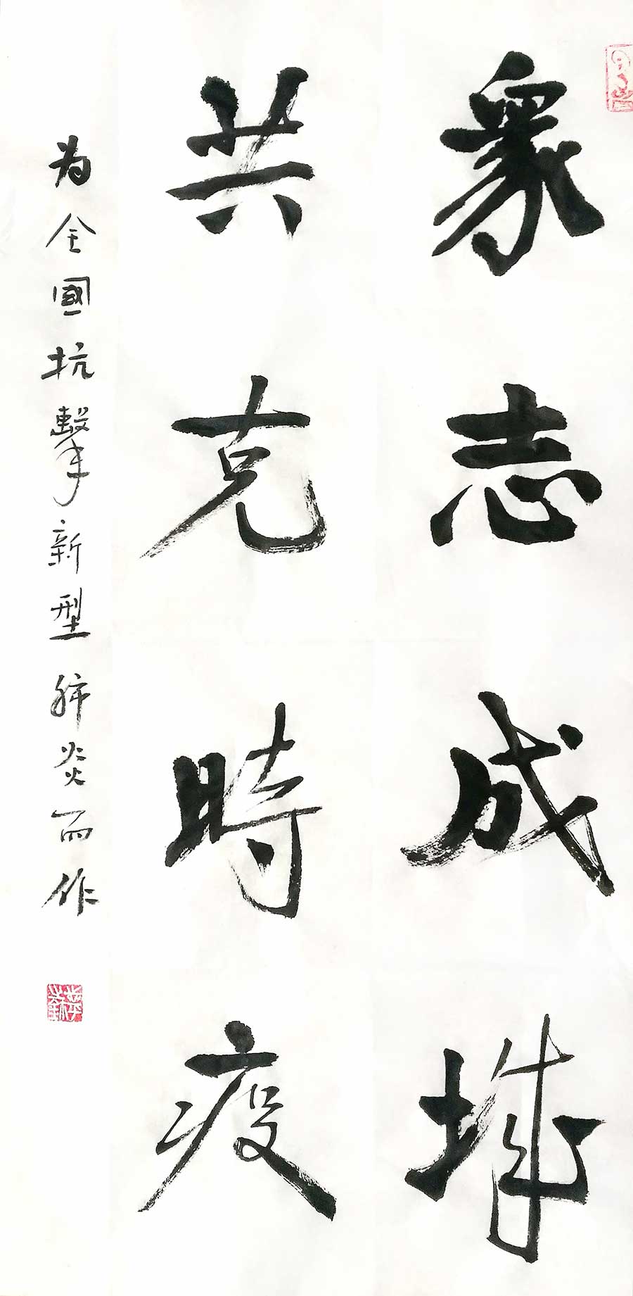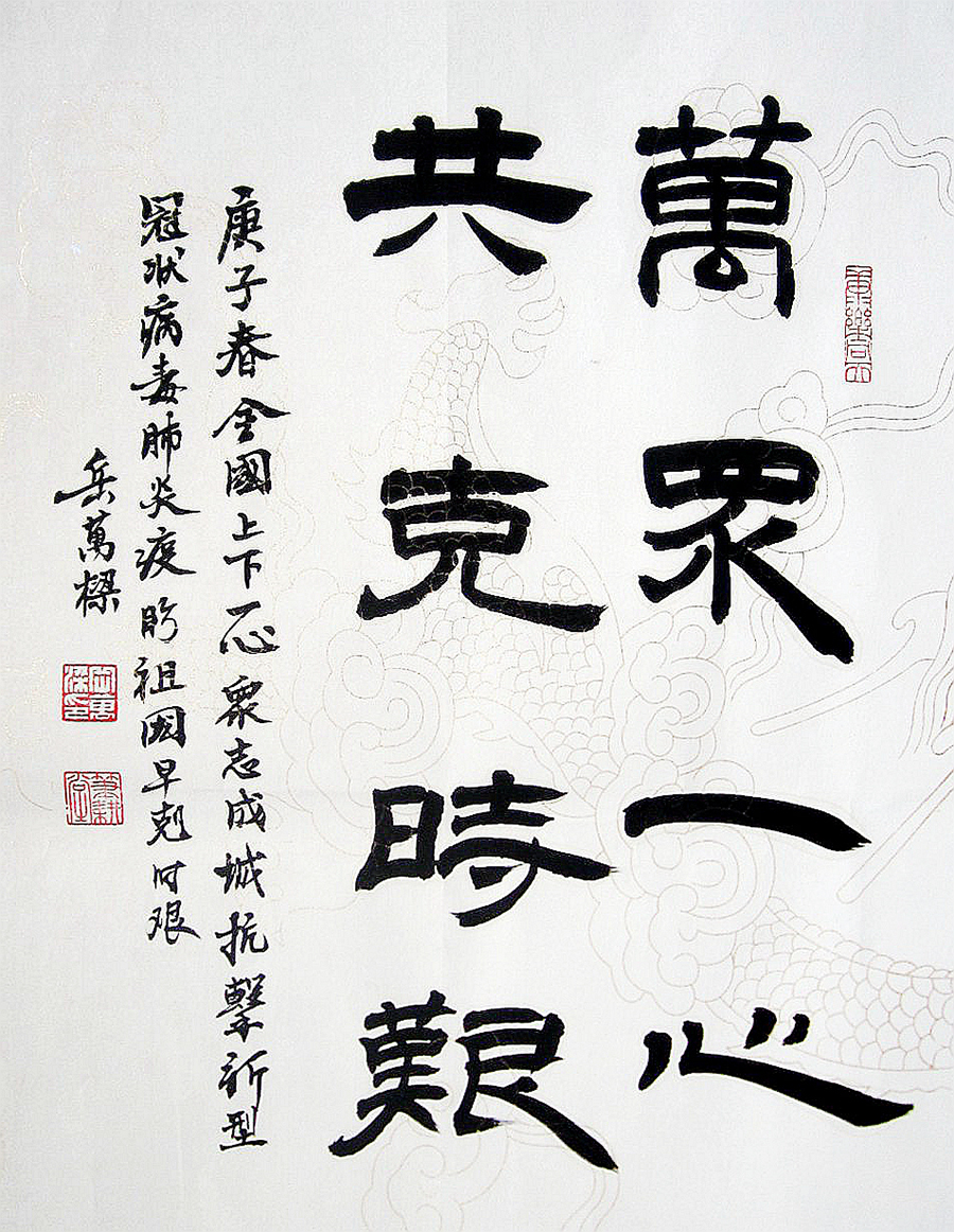 庚子新春,一场来势汹汹的新型冠状病毒感染的肺炎疫情在全国蔓延。面对疫情,习近平总书记作出重要指示,要求“广泛动员群众、组织群众、凝聚群众。紧紧依靠人民群众坚决打赢疫情防控阻击战”。在武汉、在全国各地,无数奔赴在疫情一线的工作人员同舟共济、众志成城,冒着各种风险坚守岗位,投身于这场必须打赢的疫情防控狙击战。在这场抗击疫情的战斗中,文艺工作者不能缺席。中国煤矿文联迅速组织全行业文艺工作者积极行动起来,为坚决遏制疫情蔓延势头、打赢疫情防控阻击战鼓与呼,创作出一大批各种形式的文艺作品,鼓舞全民士气,致敬白衣天使,慰问病患同胞,传递人间真情,弘扬社会正能量。中国煤矿书法家协会迅速行动起来,组织煤矿书法家,用心研墨,以爱为纸,将自己的创作激情,化作了对疫情的关切之情,两天时间创作了数百件鼓舞士气,振奋精神的书法、篆刻作品。点画间传达了550万煤矿工人声援武汉,抗击疫情的信心和决心,表达了对江城武汉的祈福、对伟大祖国的祝愿。