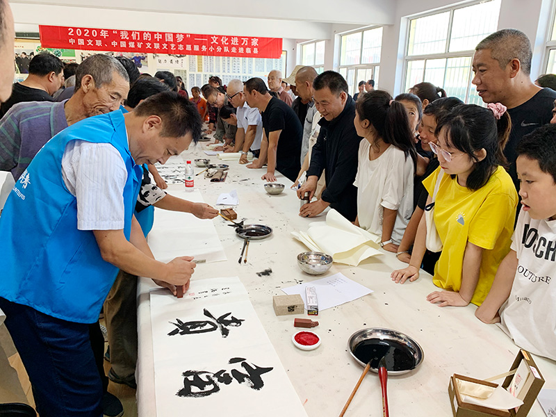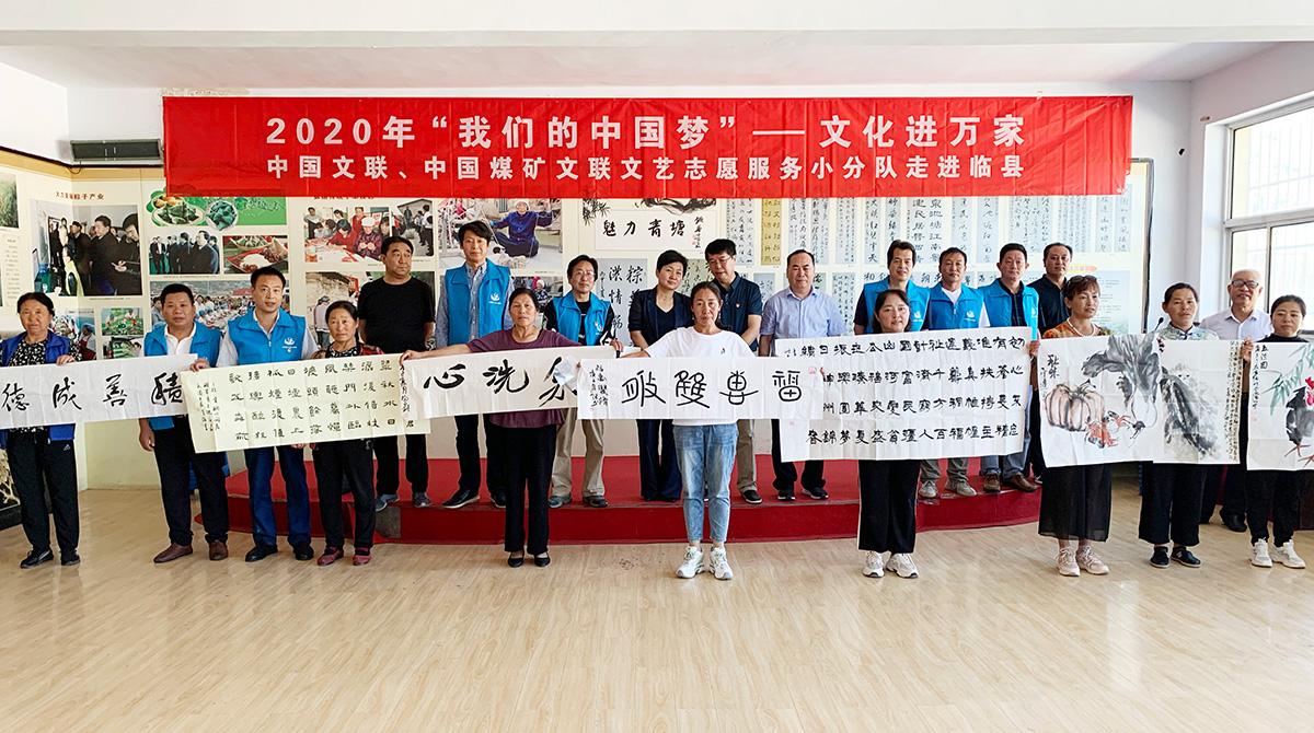 8月20日至22日,中国文联、中国煤矿文联文艺志愿服务小分队走进临县开展2020年“我们的中国梦”——文化进万家活动。中国煤矿文联秘书长、中国煤矿文联志愿者协会主席盛军带队,中国煤矿文联宣传处处长、中国煤矿文联志愿者协会秘书长辛凡忠,中国煤矿文联书协副主席马铭、杨玉剑,副秘书长侯建伟,理事傅澍乾;中国煤矿文联美协理事马凤山、周先宝、侯平远、梁志强等煤矿书法美术家参加文艺志愿服务。活动期间,小分队先后在安业乡前青塘村、临县高级职业中学进行书画作品赠送、现场创作、书法讲座和书画作品点评辅导。